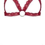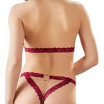 Dit verleidelijke kanten setje in dieprood bestaat uit een BH met open cups en goudkleurige ringen. De BH heeft een halternek en geen sluiting. Het bijpassende broekje heeft een stringmodel en een open kruisje. Het kettinkje maakt dit broekje nog spannender. De set is gemaakt van zachte elastische stof.